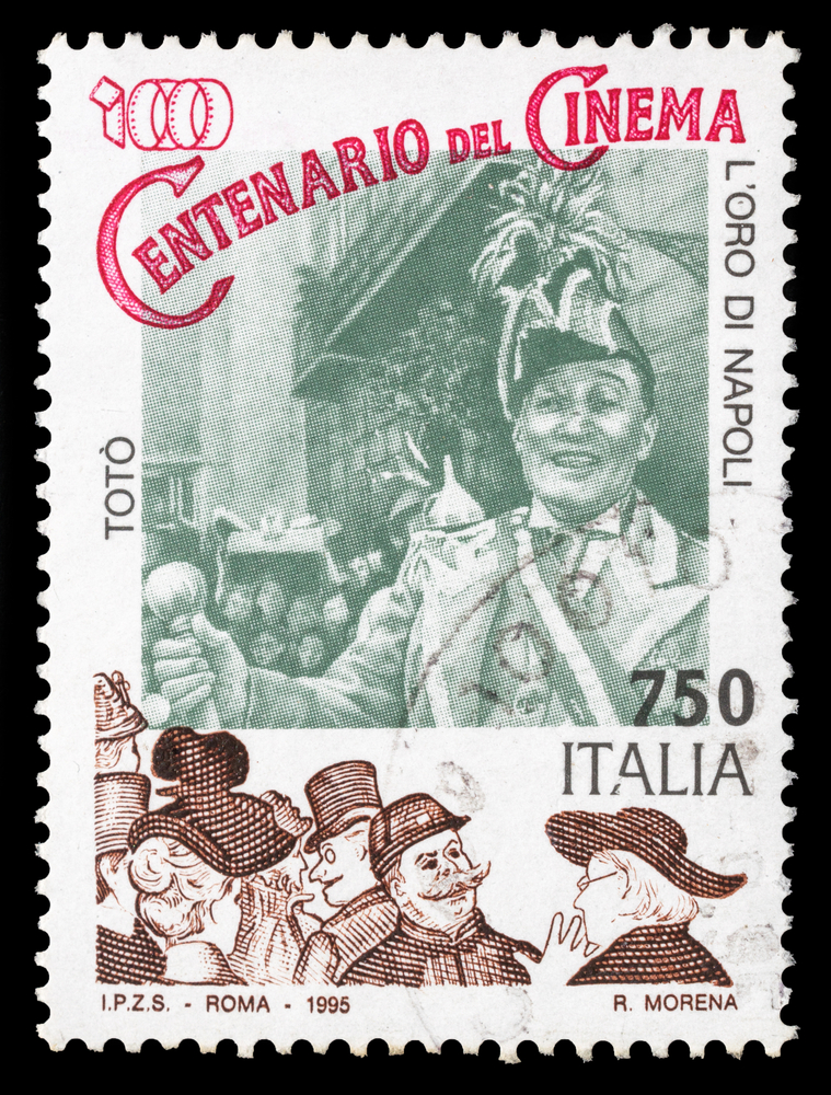 image text: Totò oli aikoinaan suosittu näyttelijä Italiassa, niin suosittu, että hänen kunniakseen tehtiin oikein postimerkki.